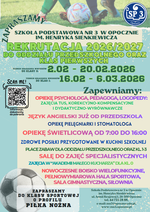 W przyszłym roku szkolnym nasza placówka planuje otworzyć klasę pierwszą sportową, ogólnorozwojową, o profilu piłka nożna. Jesteśmy na to przygotowani kadrowo i logistycznie. Mamy bardzo dobrą bazę sportową - pełnowymiarową halę sportową, nowoczesne, wielofunkcyjne boisko i salę gimnastyczną - dzięki którym wszystkie zajęcia sportowe, bez względu na warunki atmosferyczne, odbywają się na terenie szkoły. Zapraszamy do śledzenia informacji na Facebooku oraz stronie internetowej szkoły.